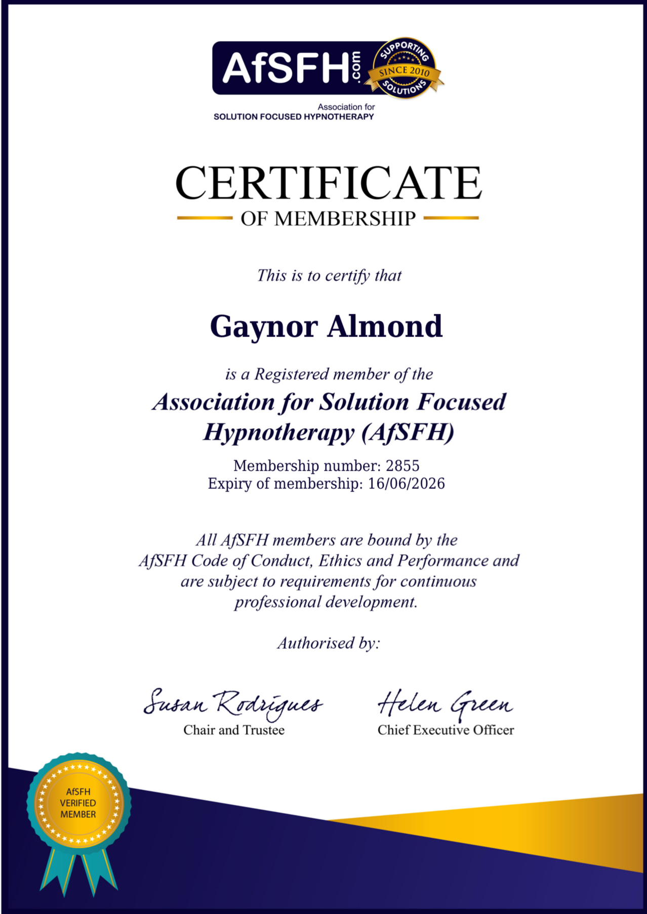 - Registered full member of the Association for Solution Focused Hypnotherapy (AFSFH)